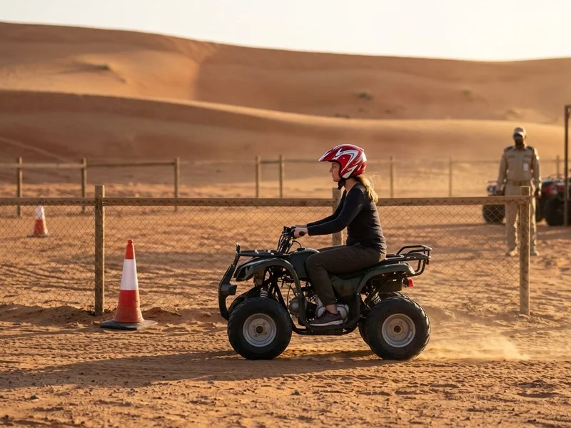 The safest way to try a quad bike in Dubai. A single-rider COBRA ATV with thumb-throttle and automatic CVT, ridden on our fenced beginner track at the Liwa Empty Quarter — supervised, speed-managed, no driving license required. Built for first-time riders aged 14 and up. Price is per rider.