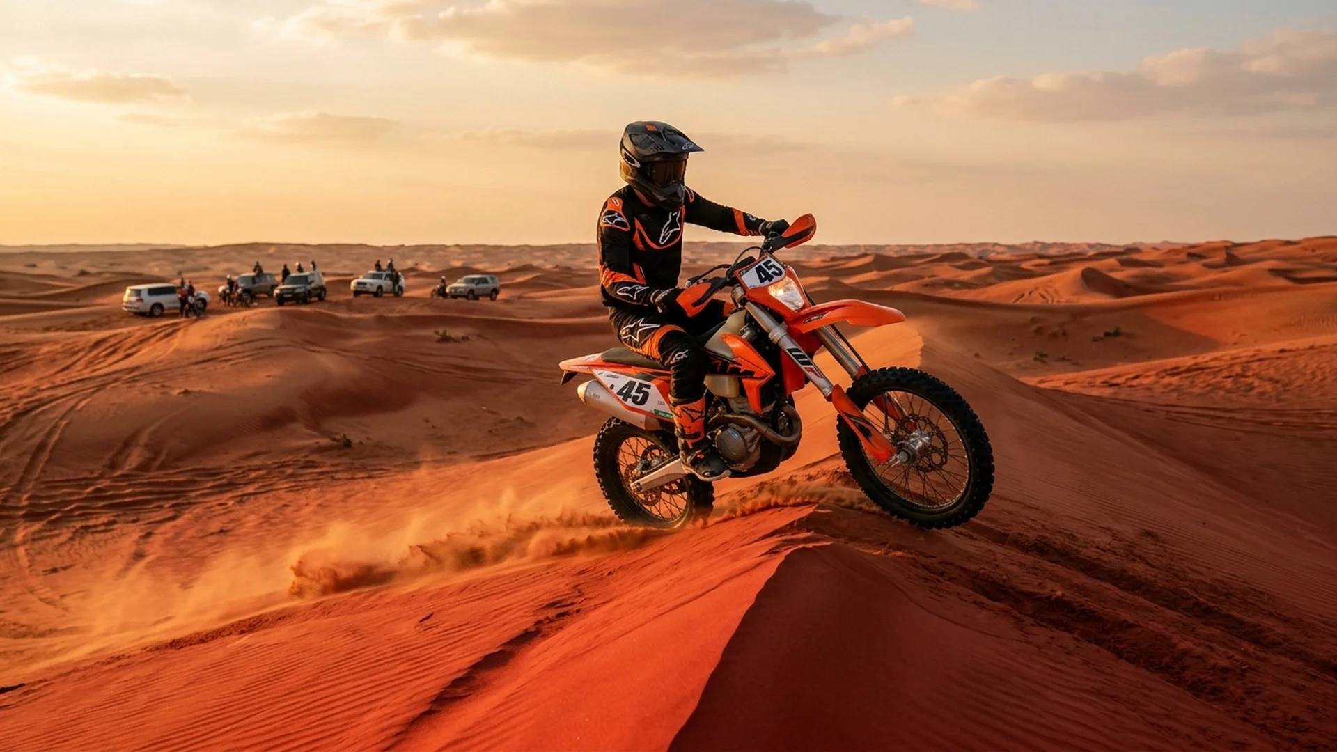 KTM 450 dirt bike on real Dubai desert. Pick 1, 2 or 3 hours. Full motocross gear, certified instructor, fuel included. Per bike pricing.