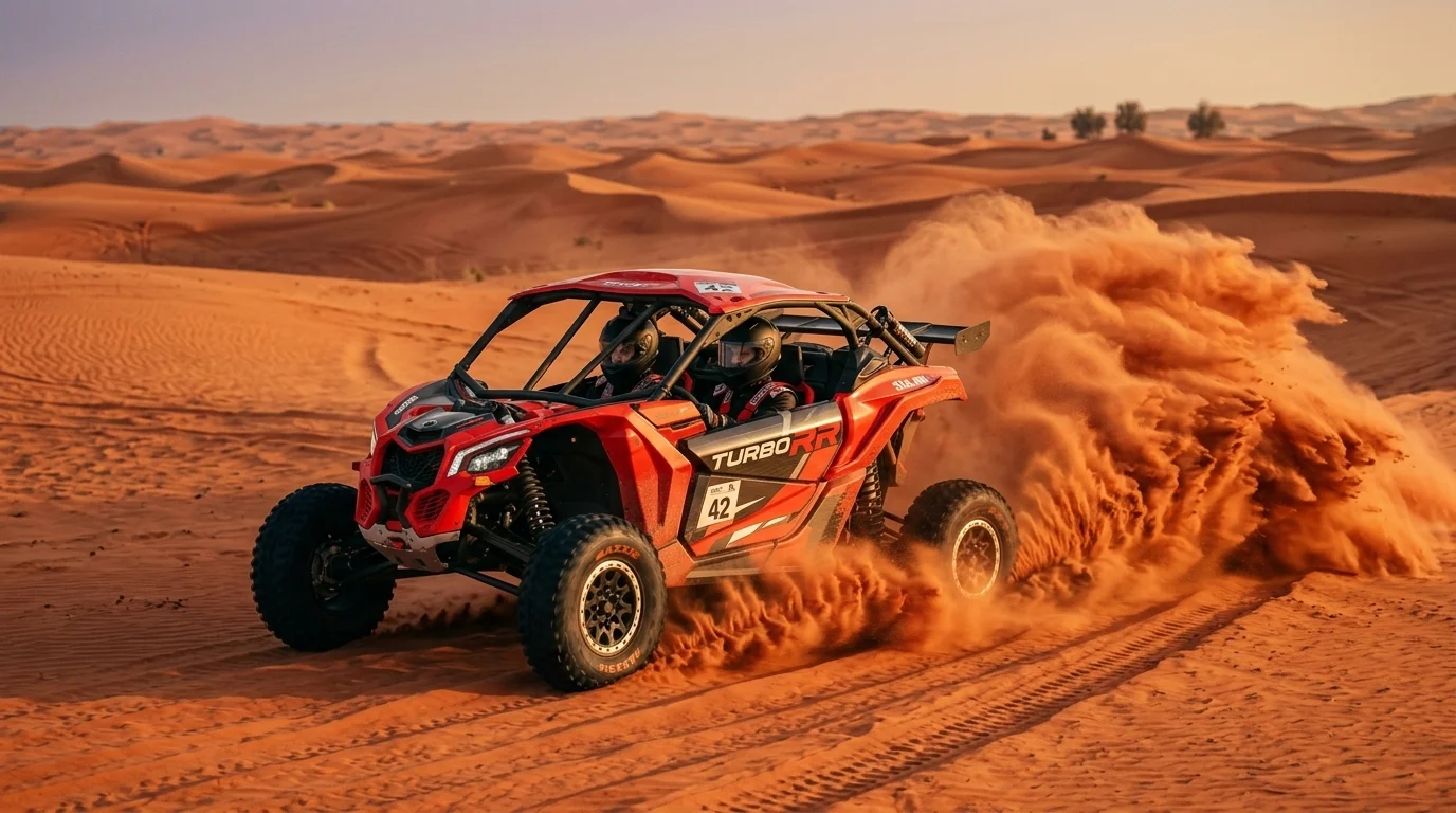 The Can-Am Maverick X3 Turbo is a turbocharged two-seat side-by-side built for extreme off-road terrain. At 172 horsepower with a 64-inch track width and a long three-link rear suspension, it is the dune buggy professional desert drivers choose for big-line riding in the Dubai desert. You can book it as a self-drive session from AED 899, with a DTCM-licensed lead guide, full safety gear and hotel pickup across Dubai.