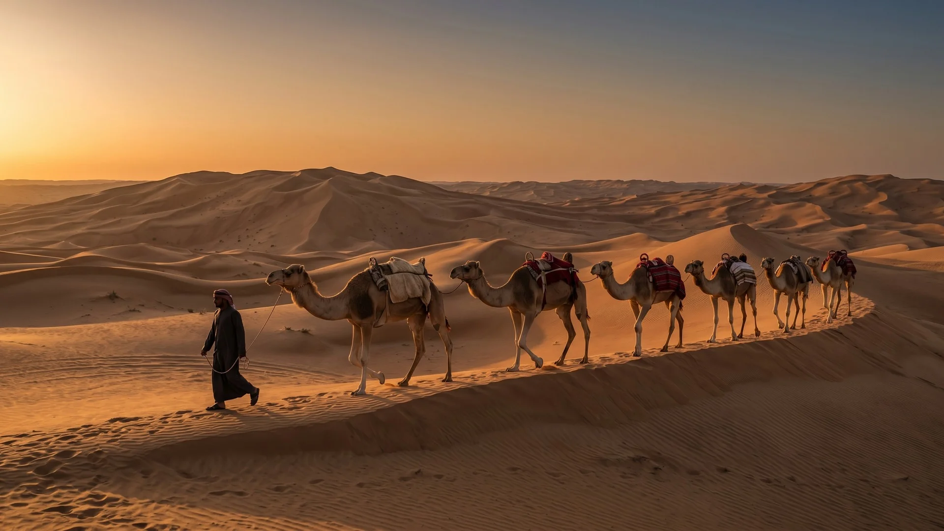 Traditional led camel ride at the Al Wadi reserve. Oryx sighting possible.